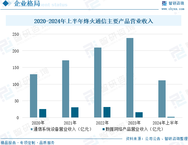 烽火通信科技股份有限公司是国际知名的信息通信网络产品与解决方案提供商,自1999年成立以来,始终专注于全球信息通信事业的进步与发展。公司主营业务立足于光通信,深入拓展至信息技术与通信技术融合而生的广泛领域,并成为我国智慧城市、行业信息化、智能化应用等领域的核心企业。面向5G时代,烽火通信秉承“最大限度挖掘数字连接价值,造福人类社会”的使命,以提振产业经济为己任,瞄准世界领先技术、提升核心竞争力、加速国际化进程,以更加开放的胸怀和更有远见的视野,贡献烽火智慧和烽火方案,让社会共享信息通信带来的美好生活。数据显示,2024年上半年,烽火通信通信系统设备营业收入为111亿元;数据网络产品营业收入为2.44亿元。