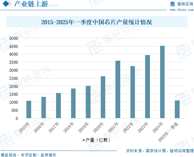 芯片作为底层核心技术之一,对于下一代互联网的建设和发展具有基础性和战略性作用。芯片通过收集、操作、转换及分析数据,支持各种宽带应用和传统电信业务,是实现宽带窄带一体化、有线无线一体化、有源无源一体化、传输接入一体化的综合业务网络的基础。与此同时,芯片的存储功能使得设备能够轻松地读取和写入数据,支持临时和持久的存储需求,这对于互联网的稳定运行和数据管理至关重要。近年来,我国持续不断地为芯片领域的研发投入大量资金,并给予强有力的支持,推动了国产芯片的蓬勃发展。国家统计局数据显示,中国芯片产量从2015年的1087.2亿颗增长至2024年的4514.2亿颗,年复合增长率为17.14%。2025年一季度,中国芯片产量为1094.7亿颗,同比增长11.59%。