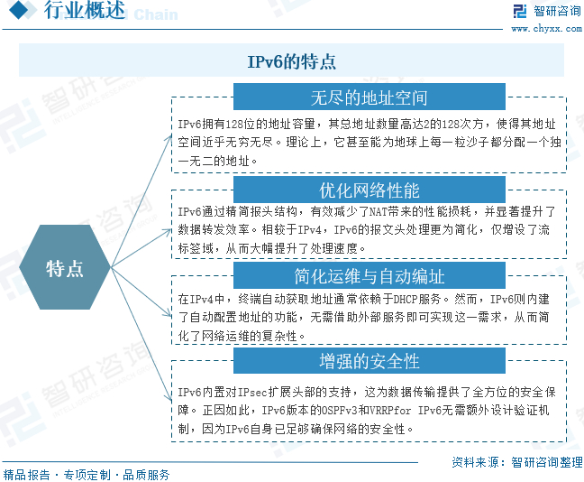 IPv6,即互联网协议第6版,是下一代互联网的核心技术。21世纪以来,随着电脑、智能手机、智能穿戴设备以及各类智能家电的迅速普及,越来越多的上网设备接入互联网,IPv4地址枯竭的问题日益凸显。随着网络技术的飞速发展,IPv6将成为未来网络演进的重要方向。它不仅扩大了地址空间,还带来了更高效的数据传输和安全性,为物联网、云计算等新兴领域的发展提供了坚实基础。