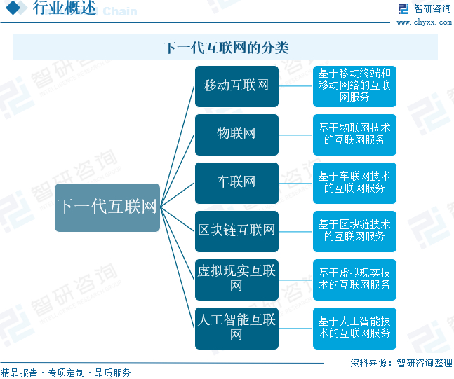 下一代互联网是一个建立在IP技术基础上的新型公共网络,能够容纳各种形式的信息,在统一的管理平台下,实现音频、视频、数据信号的传输和管理,提供各种宽带应用和传统电信业务,是一个真正实现宽带窄带一体化、有线无线一体化、有源无源一体化、传输接入一体化的综合业务网络。下一代互联网可以分为移动互联网、物联网、车联网、区块链互联网、虚拟现实互联网和人工智能互联网等几类。