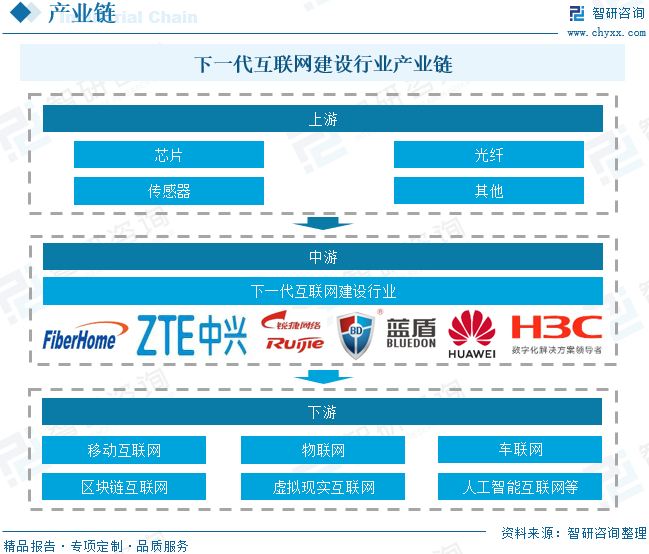 下一代互联网建设产业链上游主要是芯片、光纤、传感器等,是下一代互联网的基础,是实现各类应用的前提。产业链中游为下一代互联网建设行业。产业链下游为应用领域,主要包括移动互联网、物联网、车联网、区块链互联网、虚拟现实互联网和人工智能互联网等,这些应用行业的发展推动了下一代互联网建设行业的快速发展,为人类的生活和工作带来了更多便利和创新。