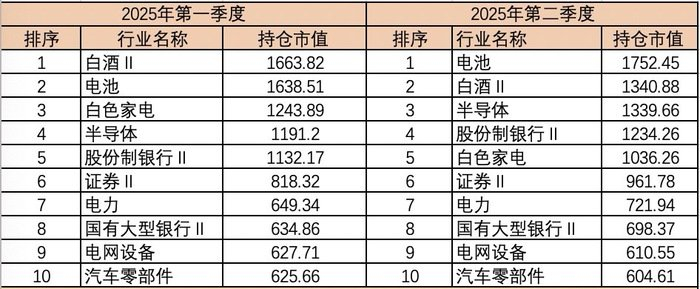 界面新闻记者统计发现,与一季度披露的数据相比,北向资金持仓市值前十的行业在今年一二季度发生了细微变化:电池、半导体持仓市值分别增加约300亿元、148亿元;白酒持仓市值缩水下滑。