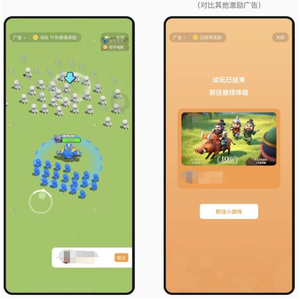 细心之人还发现了一类特殊的引流广告,那就是能够试玩的广告。只能呆看的广告大多让人生烦,但能玩的就不一样了。同样需要30秒,但可以继续在屏幕上左戳两下、右点一点地活动手指,这种事情怎么能叫等待呢。
