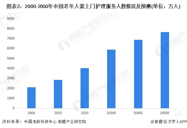 从养老服务需求来看,根据中国老龄科研中心承担的科技部国家软科学研究计划项目“促进老龄产业发展的机制和政策研究总报告”分析,2000-2050年中国老年人需要上门护理服务的人数将不断上升,2020年约为4033.3万人,2030年预计达到5896.9万人,到2050年达到7600万人左右。可见,养老服务市场的巨大潜力和紧迫需求。