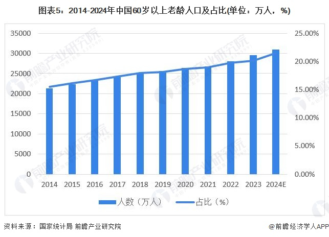 然而,人均预期寿命的提升背后,是中国社会老龄化程度的不断加深。2014年我国六十岁以上人口比例正式突破15%,此后我国人口老龄化进程开始加速,截至2023年底,中国60岁及以上人口已达2.97亿,占总人口的21.1%;而到了2024年,65岁及以上人口占比更是从2023年的15.4%上升至15.6%。