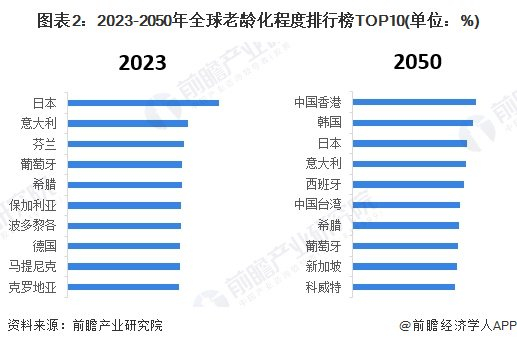 老龄化并非中国独有的问题,而是全球性趋势。据联合国发布的《World Social Report 2023》,当前全球老龄化程度最高的10个国家或地区的老龄化程度均在20%以上。而到2050年,联合国预测中国香港的老龄化程度将超过40%,成为全球老龄化最严重的区域,其他排名前10的国家或地区的老龄化程度也都将超过33%。