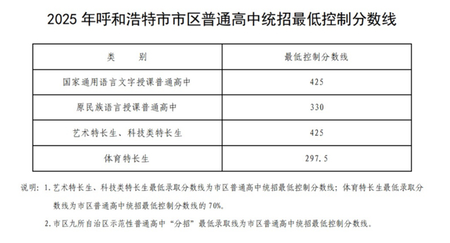 2025年呼和浩特市市区普通高中统招最低控制分数线