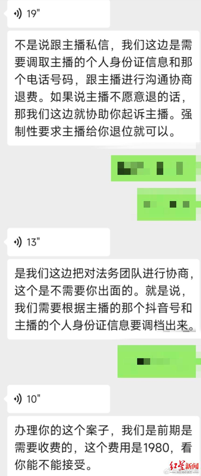 7月2日,红星资本局以消费者的身份联系了一位自称可协助退款的中介周某。周某表示,只要提供主播账号、充值记录、打赏记录,其团队可调取主播的身份证信息和电话号码,协助沟通退费;若主播拒绝,将帮助消费者起诉。