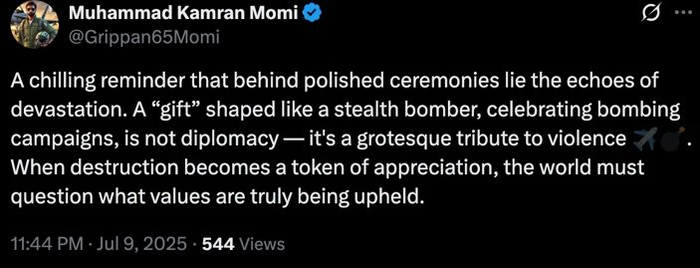 有网友评论说,“令人不寒而栗的是,在光鲜的仪式背后,回荡着毁灭的余音。用形似隐形轰炸机的‘礼物’庆祝轰炸行动,这不是外交——而是对暴力的荒诞致敬。当毁灭成为表达谢意的象征时,世人必须质疑:这究竟在维护何种价值观。”↓