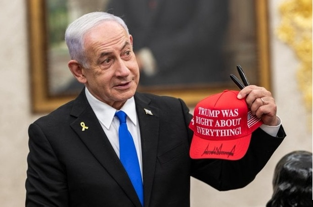 特朗普8日回赠内塔尼亚胡一顶红色棒球帽并在上面签名,帽子上印有“特朗普在所有事情上都是对的”字样。