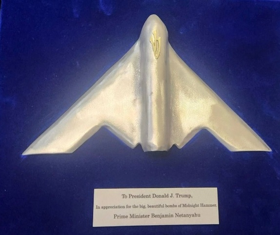 这份礼物附带的小牌匾写着,“致唐纳德·J·特朗普总统,感谢‘午夜之锤行动’(美国针对伊朗的军事行动代号)投下巨大而美丽的炸弹”。报道说,负责制作这件礼物的以色列铁匠兼艺术家亚伦·鲍勃暗示,这一B-2轰炸机造型的“门柱圣卷”装饰盒由被击落的伊朗导弹残骸打造而成。