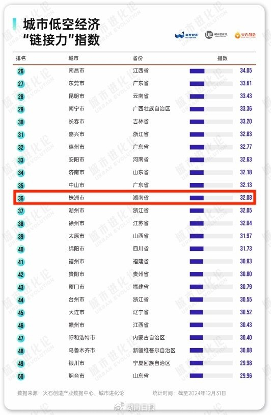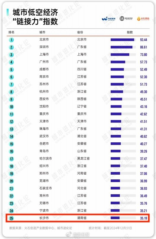 7月8日,每日经济新闻·每经智库、城市进化论联合火石创造发布城市低空经济“链接力”指数50强榜,通过企业聚集度、资本活跃度、创新聚集度和环境友好度四大维度评估近300座城市。长沙和株洲两城跻身低空经济城市50强,分别位列该榜单的第25位、第36位。