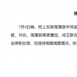 7月8日晚,网上反映湘潭县市场监督管理局执法大队队长肖某有关生活作风问题,对此,湘潭县高度重视,成立联合调查组,迅速开展调查。目前,已对肖某作出停职处理,后续将根据调查情况,依规依纪依法作出严肃处理。