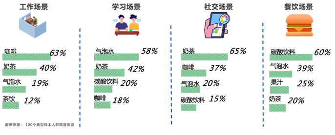 至于是哪些人在买呢,毫无疑问是以Z世代为代表的年轻人。有调查数据显示,超半数年轻群体每周购买饮料3次及以上,消费场景关联性强,有58%的Z世代在学习场景下会首选气泡水,60%的Z世代在餐饮场合偏好碳酸饮料。