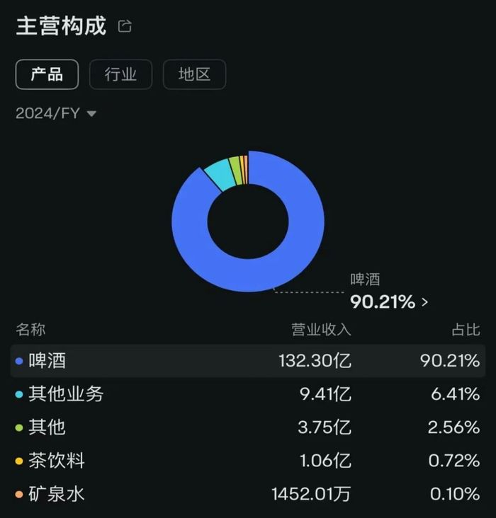 事实上,很早之前就开始布局饮料产业的燕京啤酒,其问题是仍然没有跳出以啤酒市场为核心的大盘。数据显示,2024年燕京啤酒的啤酒业务所贡献营收为132.3亿元,同比增长约1%,营收占比高达90.21%,而茶饮料业务实现营收1.06亿元,同比增长48.43%,营收占比连个位数都不到,才仅约为0.72%。可见,非啤酒业务并未对该公司的业绩增长起到很大的驱动作用。