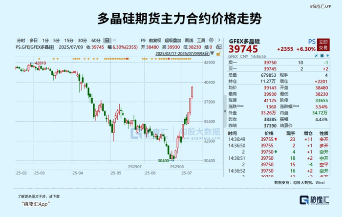 如作为光伏电池关键材料的多晶硅市场价格近日已经出现连续强势上涨,7月8日多晶硅主力合约甚至迎来了罕见涨停,涨幅7%,今日继续大涨近6%,报价最高触及4万元/吨大关,目前多晶硅期货价格累计涨幅已超过了30%。
