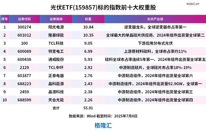 中证光伏产业指数,覆盖光伏产业链全环节:硅料、硅片、电池片、组件、逆变器、辅材及光伏设备等核心领域的50只成份股,前十大权重股包含全球逆变器龙头阳光电源、全球硅料龙头通威股份、全球六大组件出货大户晶科能源、隆基绿能、晶澳科技、天合光能、通威股份和正泰电器,合计权重高达55.91%。