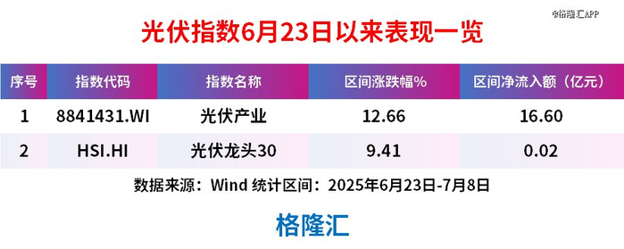 光伏行业的内卷无人质疑,但从产业链角度来看,硅料、硅片、电池片和组件环节是当前内卷最严重的环节,这也是为何光伏板块自6月23日反弹以来,跟踪中证光伏产业指数的ETF涨幅(12.66%)显著高于跟踪光伏龙头30指数(9.41%),跟踪前者指数的ETF净流入额超16亿元。