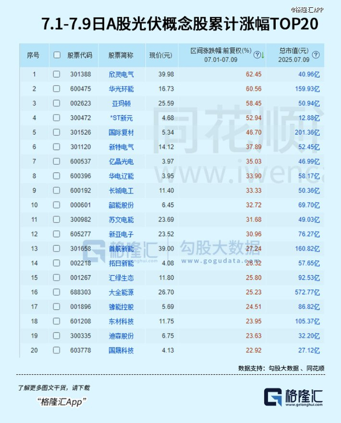 类似的强势个股并不少,数据显示,截至7月9日收市,7月来A股光伏概念股中累计已有近70只个股涨幅超过10%,包括25只涨幅在20%以上,成为月内涨幅最显著的重点大板块。