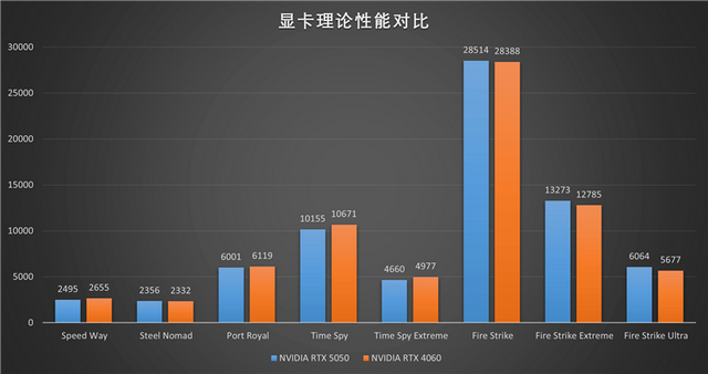 RTX 5050在定位上是取代上上一代的RTX 3050,上代TX 40系列并没有同位产品,但经过技嘉出厂预超频,拥有更高加速频率的技嘉RTX 5050 GAMING OC显卡,在3DMark理论性能测试中同RTX 4060几乎没有差距。