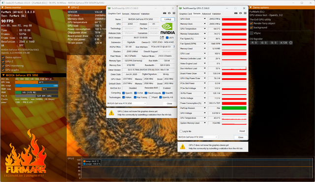 我们使用Furmark对技嘉RTX 5050 GAMING OC显卡进行10分钟的烤机,室温约29度,整卡功耗稳定在130W,核心频率2445MHz,温度64.0度,风扇转速1650RPM。