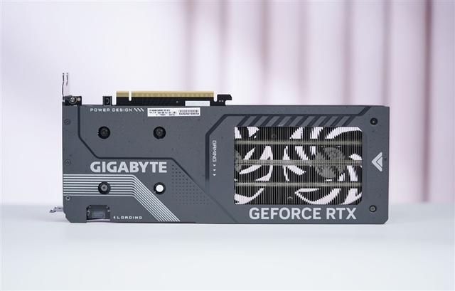 技嘉RTX 5050 GAMING OC显卡的加固背板同样是工业风设计,巨大的散热窗占到了约一半的长度,内部散热器鳍片和热管清晰可见。