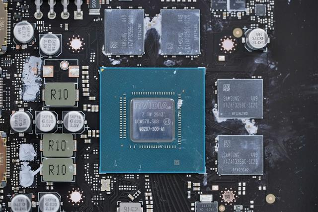 技嘉RTX 5050 GAMING OC显卡的GPU芯片特写,芯片代号为GB207-300。显存和供电MOSFET等关键组件都使用了服务器级导热凝胶,确保和散热器铜底良好接触高效散热。