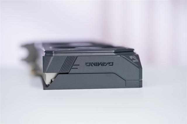 显卡尾部采用全封闭拼接设计,前盖延伸部分有细密的防滑点阵和“GAMING”字样。