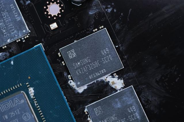 来自三星的GDDR6显存颗粒特写,一共四颗环绕GPU布置,共同构成8GB的容量。