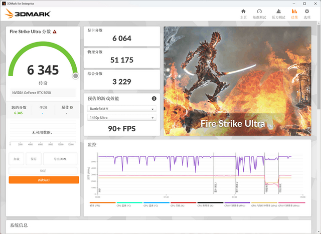 在3DMark的Fire Strike Ultra(DX11+4K渲染分辨率)测试中,总成绩为6345,其中显卡分数为6064。