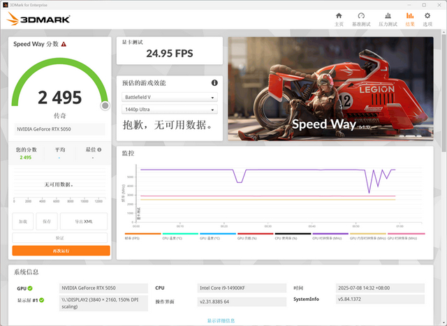 在3DMark测试综合性能的Speed Way测试中,总成绩为2495,其中显卡测试成绩为24.96FPS。