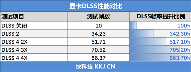 在3Dmark NVIDIA DLSS功能测试中,关闭DLSS 4时帧数为10FPS左右,开启DLSS 4 2x之后帧数上升为51.71PS,开启DLSS 4 3x之后帧数上升为70.52FPS,开启DLSS 4 4x之后帧数上升为86.37FPS。