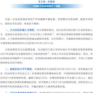 7月8日,据微信公众号“无锡滨湖发布”,为进一步促进滨湖区房地产市场健康平稳发展,持续推动住房消费,提振市场信心,无锡市滨湖区发布进一步促进住房消费的若干措施。其中提到,支持鼓励房地产开发企业对购买滨湖区新建商品住房的江苏省城市足球联赛参赛球员和观赛球迷,凭参赛或观赛等证明给予每套3万元-5万元的购房补贴,从发布之日至2025年10月31日。