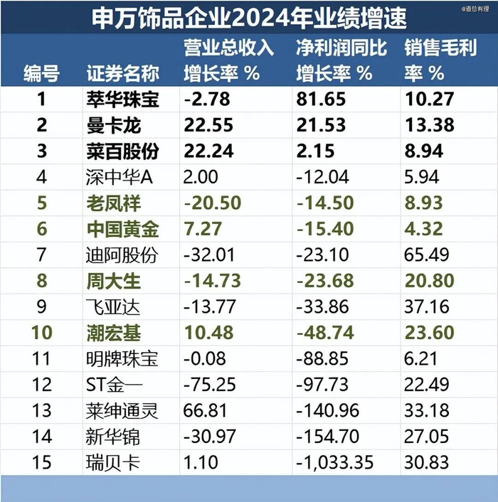 典型的例子是周大福,2009财年至2017财年,周大福的毛利率还在29%左右。2018财年至2021财年,毛利率维持在28%左右;到2022财年,毛利率突然明显下降,为22.58%。再到2024财年,毛利率为20.50%。