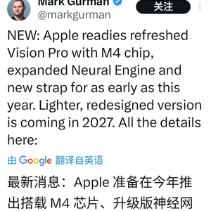 7月10日,彭博社马克・古尔曼(Mark Gurman)发文称,苹果准备在今年推出搭载M4芯片、升级版神经网络引擎和全新表带的全新Vision Pro。此外,更轻巧、重新设计的版本将于2027年上市。