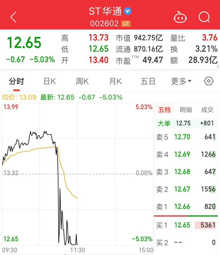 今天上午,ST华通盘中一度涨超3%,总市值突破1000亿元关口,随后股价直线跳水,盘中触及跌停,上午收盘下跌5.03%,目前最新市值为942.75亿元。