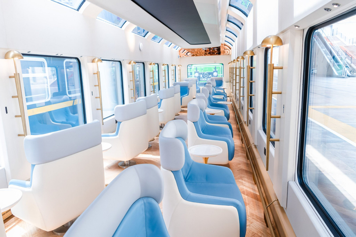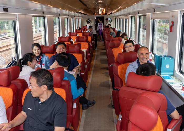 从“便捷”到“讲究”,实现服务新升级。走进车厢,从特色卡座,到头等舱尊享座椅,再到独立包厢,非常舒适惬意。车内布局也非常精致和巧妙,掐丝珐琅、景泰蓝等非遗工艺装点内饰,让车厢里的风景同样精彩。智能交互显示屏以及超大尺寸 LED 车顶天幕,实现科技创新与文旅体验深度交融。此外,列车还对座椅、厕所等硬件设施进行了适老化改造,为银发旅客打造了安全、温馨的旅居环境。舒适的旅行环境,自然让游客体验感更好、满意度更高。