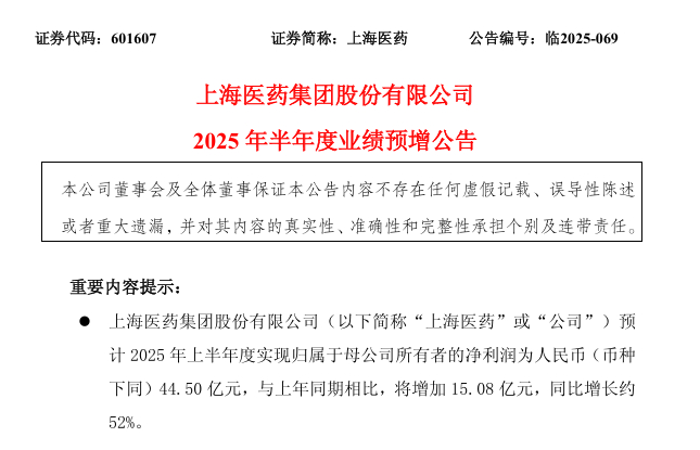 上海医药2025年半年度净利预增超50%