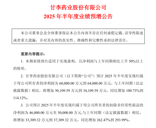 甘李药业7月9日晚间发布业绩预告,预计2025年半年度实现归属于母公司所有者的净利润为6亿元~6.4亿元,与上年同期相比,将增加约3.01亿元~3.41亿元,同比增加100.73%~114.12%。2025年上半年,公司实现归属于母公司所有者的净利润较去年同期大幅增长,主要受益于营业收入的显著提升及公司费用的精细化管控。