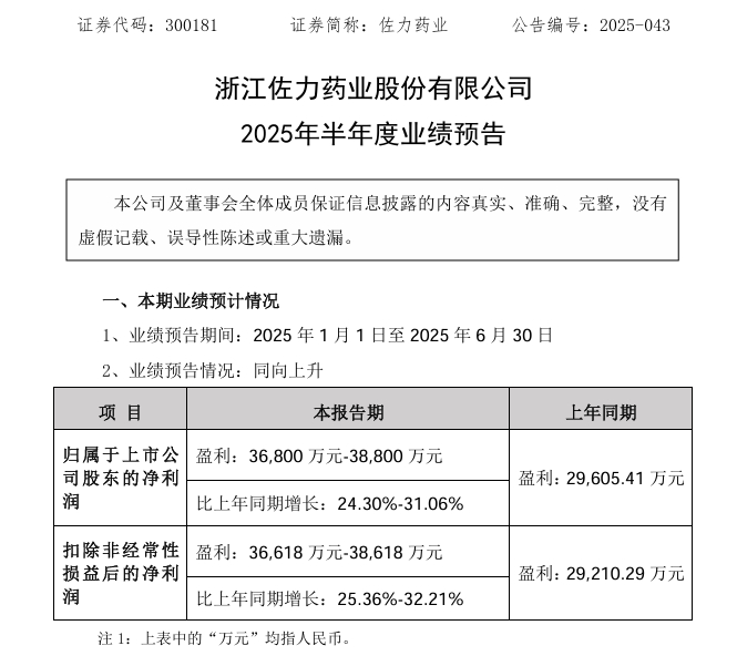佐力药业披露2025年半年度业绩预告,公司预计归属于上市公司股东的净利润3.68亿元至3.88亿元,同比增长24.30%至31.06%。扣除非经常性损益后的净利润3.66亿元至3.86亿元,同比增长25.36%至32.21%。