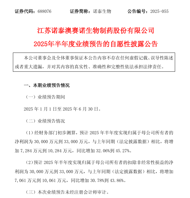 诺泰生物:上半年业绩预增32%至45%
