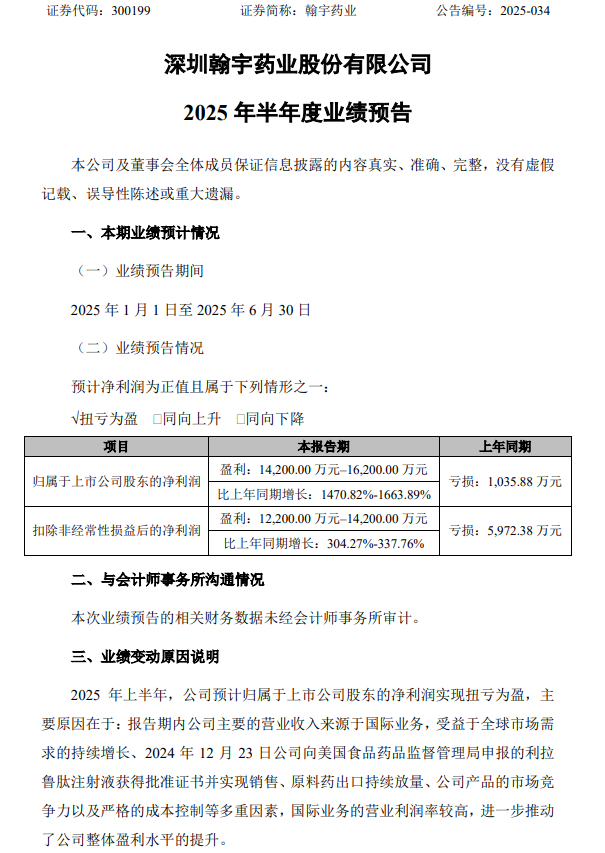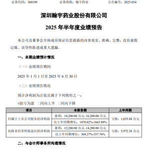 翰宇药业近日发布的2025年半年度业绩预告显示,公司预计上半年实现归母净利润1.42亿元至1.62亿元,同比增长1470.82%至1663.89%。