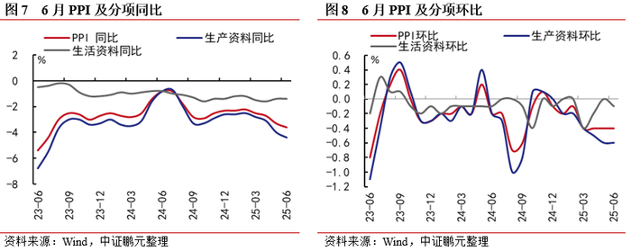 PPI环比延续下行,同比跌幅继续扩大,主要受到部分原材料价格季节性下行、煤炭进入需求淡季、出口链价格承压、基数走高等因素的影响。6月,PPI同比-3.6%,低于wind预期(-3.2%),低于前值(-3.3%),连续33个月增速为负,创下近23个月以来最大降幅;PPI环比-0.4%,和上月持平,连续7个月下降,且弱于季节性(-0.06%)。从同比价格组成因素看,6月PPI价格中翘尾因素和新涨价因素分别影响-1.6pct和-2.0pct,较上月分别上行0.2pct、下行0.5pct,因此新涨价因素是PPI同比继续下降的主要原因。从结构上看,生产资料价格和生活资料价格同比分别为-4.4%、-1.4%,分别较上月下降0.4pct、持平,生产资料价格是拖累项,也显示生活资料中的部分行业价格具有韧性,其中衣着类、一般日用品类和耐用消费品类同比增速均有所回升,侧面反映促消费政策对相关需求的积极带动作用。