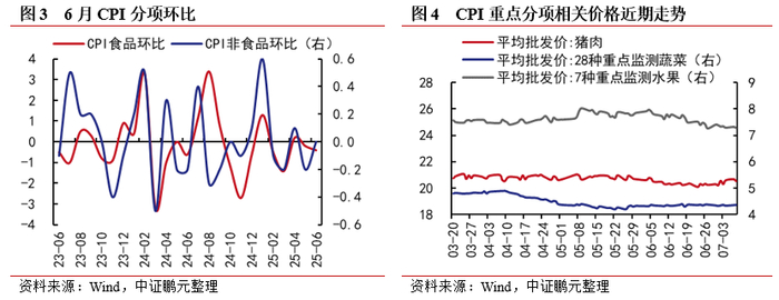 (1)CPI同比增速回升,由负转正,食品项和非食品项均形成支撑,核心通胀再次小幅上升,且为年内最高值。6月CPI同比增速转正,较上月上升0.2pct;环比-0.1%,较上月上升0.1pct,略强于季节性(-0.18%)。分项来看,CPI食品项、非食品项同比均较上月上升0.1pct,共同推动CPI转正。核心CPI小幅上升0.1pct,连续四个月增速为正,而且为年内最高值;但环比持平(0.0%),近似持平于季节性(-0.06%),持平于前一月环比(0.0%)。