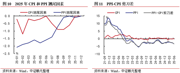 (1)6月通胀水平分化,PPI继续下行,预计三季度CPI同比中枢在零值附近,四季度小幅上行,PPI同比继续震荡磨底,同比跌幅会收窄。在总需求没有明显改善、外部冲击仍在的背景下,后续CPI同比预计保持低位运行,中枢在零值附近,向上弹性有限,四季度翘尾因素对CPI同比增速的拖累作用减弱。对于PPI,原油价格暴跌后触底反弹,带动国内相关行业价格回暖,但是中长期仍受制于关税摩擦、产油国政策调整等核心因素;国内定价的黑色金属、非金属、煤炭等工业品价格受到高库存、工业需求偏弱、房地产下行等因素的制约,延续下跌态势。整体来看,关税的负面影响逐步显现,建材、出口等相关行业价格继续承压,PPI环比上涨动能仍较低;下半年翘尾因素是短期支撑,叠加新一轮去产能政策持续推进,PPI同比跌幅可能收窄。