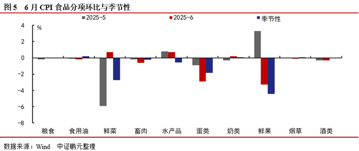 (1)食品多数分项价格下行,鲜菜、鲜果和水产品受天气和休渔期等影响,均强于季节性,猪肉价格环比跌幅扩大,同比转负。6月CPI食品环比-0.4%,较前一月增速下降0.2pct,强于季节性(-0.9%),主要受到高温、降雨较常年同期偏多的影响。食品中鲜菜、鲜果、水产品再次强于季节性,环比增速涨跌不一,畜肉、蛋类等分项弱于季节性。具体来看,受高温天气、部分地区暴雨、伏季休渔期等因素影响,鲜菜和水产品供给端减少、成本端上升,价格环比均上涨0.7%,在食品分项中涨幅最大,且均强于季节性(-2.7%和-0.6%),鲜果价格环比-3.3%,强于季节性(-4.4%);假期对猪肉消费的提振作用减退,叠加高温下猪肉进入需求淡季,供给端养殖户因高温增多出栏,猪肉价格震荡下行,环比下降1.2%,降幅扩大0.5pct,同比在连续上涨后首次转负,为-8.5%。猪价前瞻指标——5月能繁母猪存栏量相对前月小幅上行,继续保持相对高位,显示猪肉去产能节奏偏慢;7月以来猪肉价格走势平稳,小幅上行。