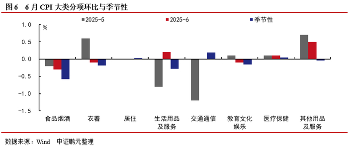 (2)非食品分项环比回暖,工业消费品价格是主要支撑,家用器具、交通工具等核心商品价格走强,节假日后出行服务需求减少。6月CPI非食品价格环比0.0%,较前一月上升0.2pct,持平于季节性(0.00%)。八大分项中除了居住、交通通信弱于季节性,其他分项均强于季节性。工业消费品价格环比由降转涨,同比降幅收窄0.5pct,对CPI同比的下拉影响比上月减少约0.18pct,是CPI同比转正的主要原因;其中,国际油价上升影响能源价格降幅比上月收窄1.0pct,对CPI同比的下拉影响比上月减少约0.08pct,交通工具用燃料分项环比上涨0.3%,较上月上升4.0pct,对CPI环比从大幅拖累项转为支撑项;受国际大宗商品价格变动影响,金饰品和铂金饰品价格同比分别上涨39.2%和15.9%,合计影响CPI同比上涨约0.21pct。不过油价修复、铂金大涨等属于暂时性因素,持续性待观察。其他分项中,家用器具、交通工具价格环比增速为0.0%和-0.4%,均强于季节性,可能与618降价后价格回补和促消费政策有关;反价格内卷政策持续推进,燃油小汽车和新能源小汽车价格本月同比分别下降3.4%和2.5%,降幅分别为近28个月和26个月最小;毕业季房屋租赁需求回暖,房租分项环比由下跌0.1%转为上涨0.1%;节假日后出行需求减少,旅游分项环比转为下跌,较上月下行1.6pct。
