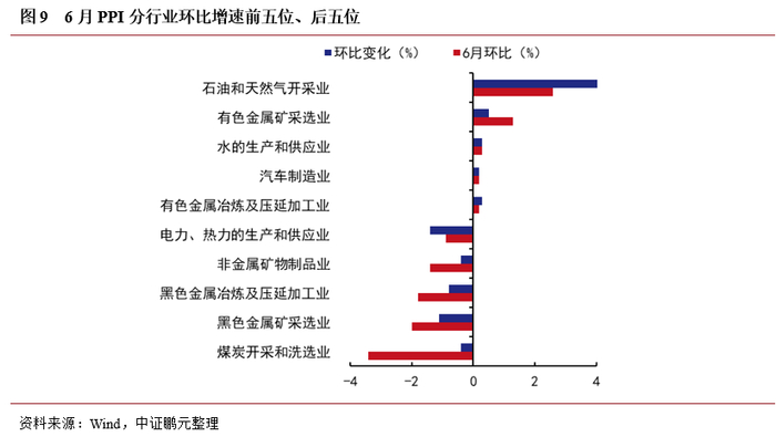 (1)能源分项:国际油价5月和6月边际修复,价格逐步传导到国内,国内石油相关行业价格也边际回暖,石油和天然气开采业价格环比增速转正,由-5.6%升到2.6%,石油煤炭及其他燃料加工业价格环比跌幅收窄,由-3.1%升至-0.6%;天气变热后煤炭需求进入传统淡季,煤炭供应和库存充足,叠加新能源发电成本低、替代作用强,煤炭开采和洗选业环比下跌3.4%,连续八个月下跌,且跌幅扩大0.4pct。