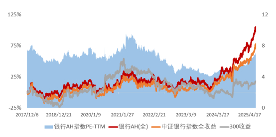 自2017年12月6日指数发布以来至2025年7月4日,银行AH全收益指数累计涨101.8%,同期中证银行全收益、沪深300全收益涨幅分别为75.96%、17.41%。