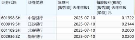 消息面上,中信银行、江苏银行、北京银行、郑州银行今日派发股息,每股税前股息分别为0.1722元、0.2144元、0.2元、0.2元。